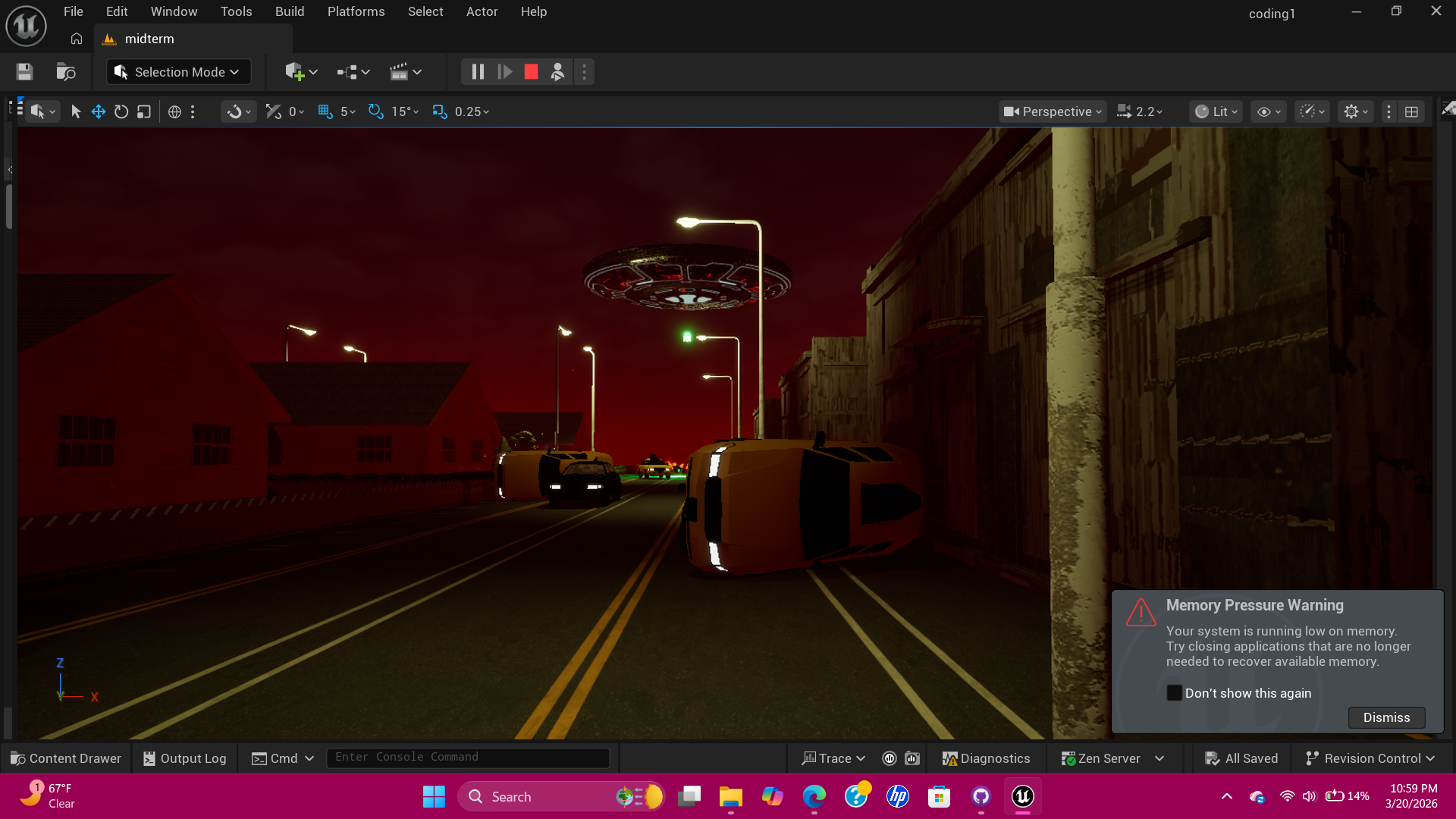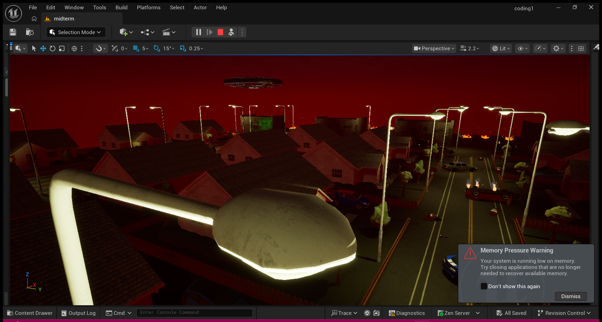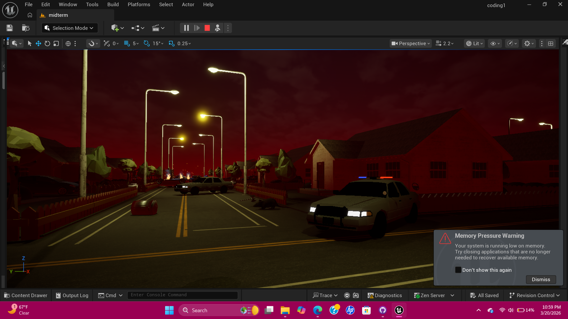 I made my own custom array of dialouge so as the player progress through my simple game they get different messages. I added an aray of colors to certain street lights to help give a slight possible hint to the players of where they need to go. Lastly i made an array of fire in different spots through the game, to help give a more real feal of a zombie outbreak.